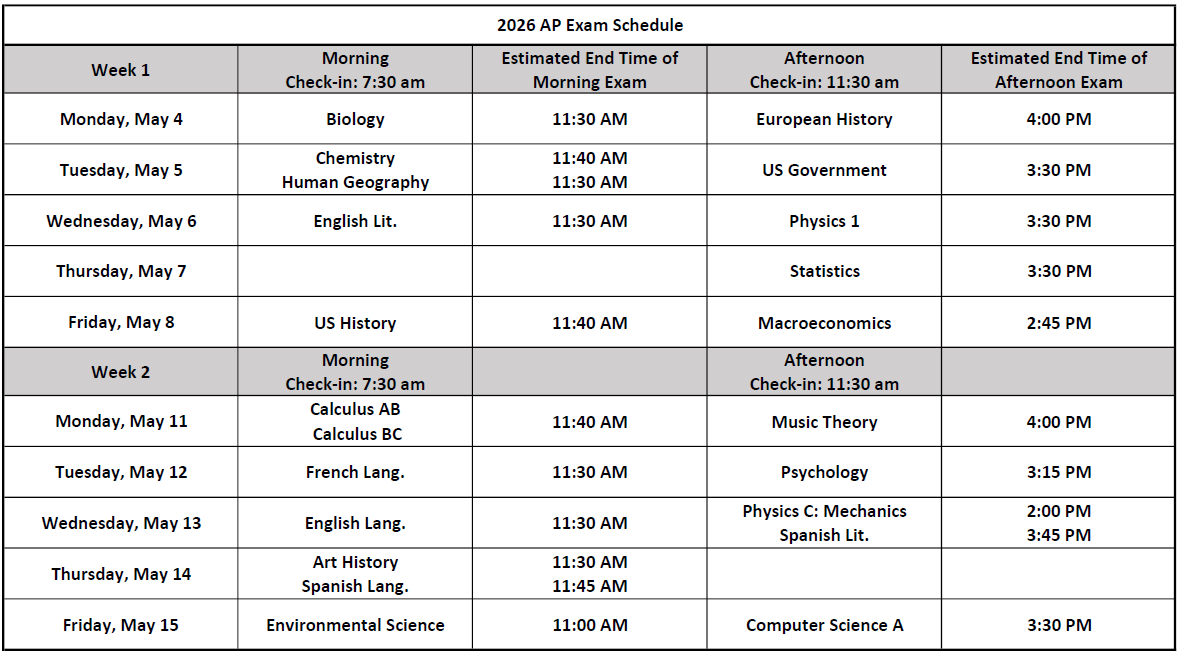You are taking the AP English Literature Exam on Wednesday, May 6th. Check-in begins at 7:30 am and the exam will end at approximately 11:15 am. We will automatically clear your attendance for periods 0, 1 and 3. If you plan to not attend 5th period, complete this form to be excused from 5th period. If you do not submit this form, you will be expected to attend 5th period and will be marked truant if you do not attend.If you end up not taking an exam, your attendance will be corrected and you will be considered truant if you do not attend all classes that day.